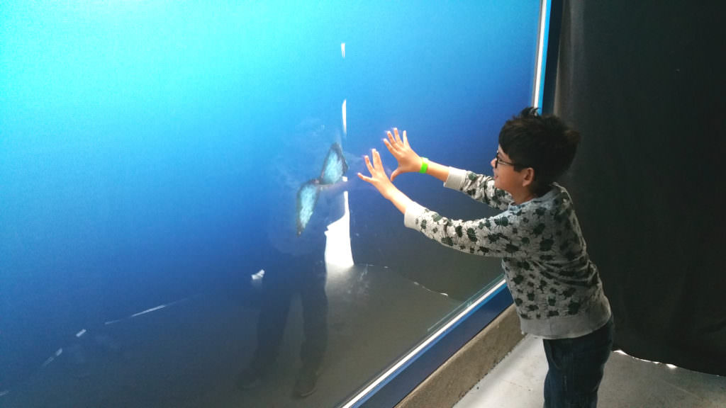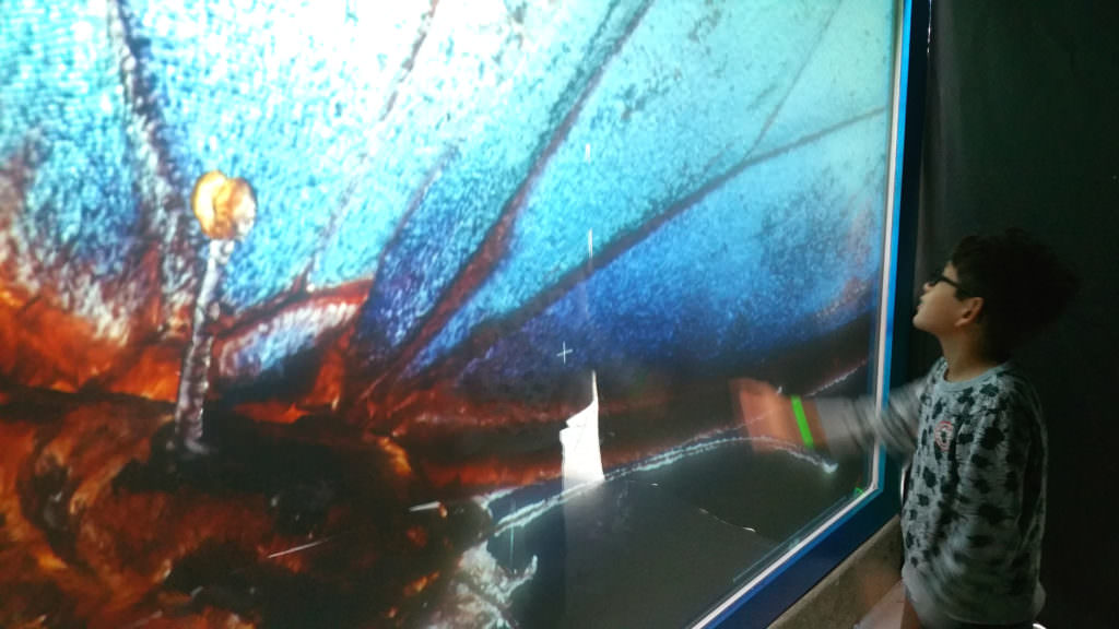 Our interactive touch screen display in the Butterfly Pavilion is up and running. It still needs some tinkering, but right now you are able to view and manipulate 3D models of a Blue Morpho and Monarch butterfly. The 3D models were created using real butterflies, so each model is 100% anatomically correct.