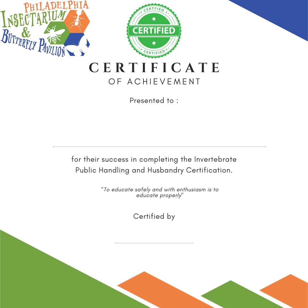 The Insectarium and Butterfly Pavilion offers the Invertebrate Public Handling and Husbandry Certification to promote educated and safe interactions between the invertebrate and the candidate desiring to care for it. The candidate will go through a series of training sessions to ensure that they are not only able to safely handle any of our invertebrates but also know how to properly care for them. This includes but is not limited to learning how to build the invertebrate’s enclosure and what materials to use, understanding its diet and sleeping habits, and recognizing when the invertebrate is in good health or not. They will also be able to educate the public using the extensive they will have acquired from our educators.